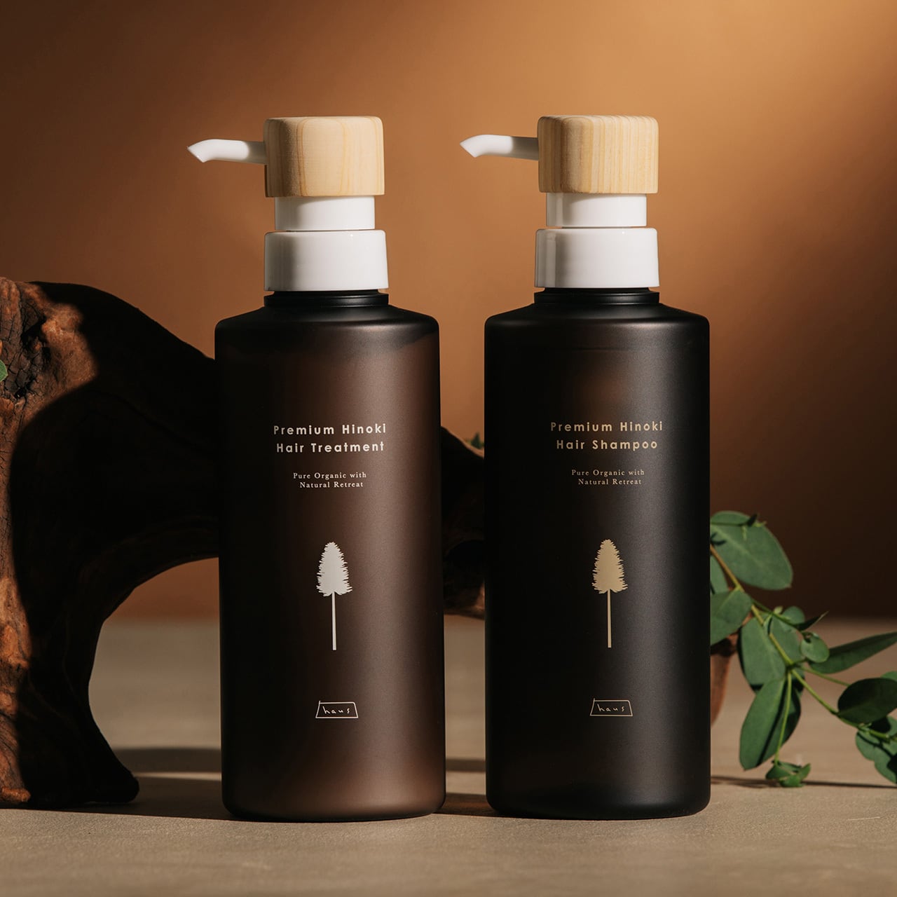 シャンプー・トリートメントの凛とした深いブラウンショルダーボトルは、品位ある神社・仏閣頭部の美観と新陳代謝を担いながら、一本一本丁寧に整えられ優美な立体を保ち続けるこの「檜皮葺」へのオマージュです。